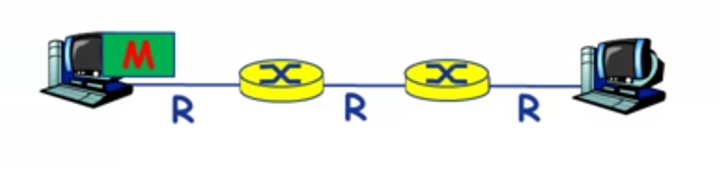 传输延迟:源主机将报文(信息)拆分发送两个分组,L bits/分组,通过一个R bps的链路进行传输。从发送第一个比特开始计时,到最后一个比特到达结束,这段时间叫做传输延迟/传输时延/发送延迟/发送时延。