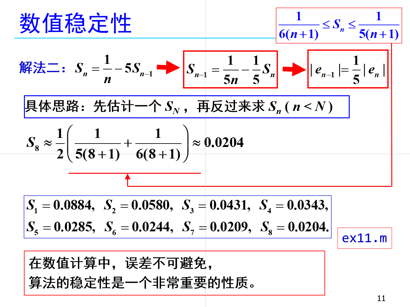 定义:若计算过程中误差不增长,则算法稳定;否则不稳定。